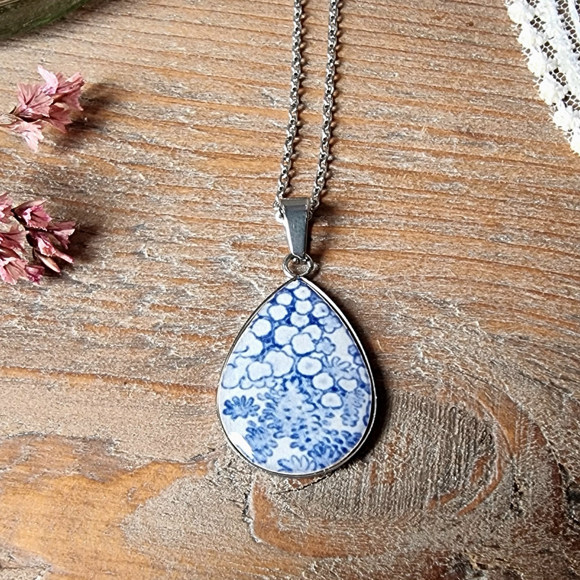 Ce collier met en valeur un fragment d’assiette ancien au motif bleu fleuri, élégant et plein de détails.
