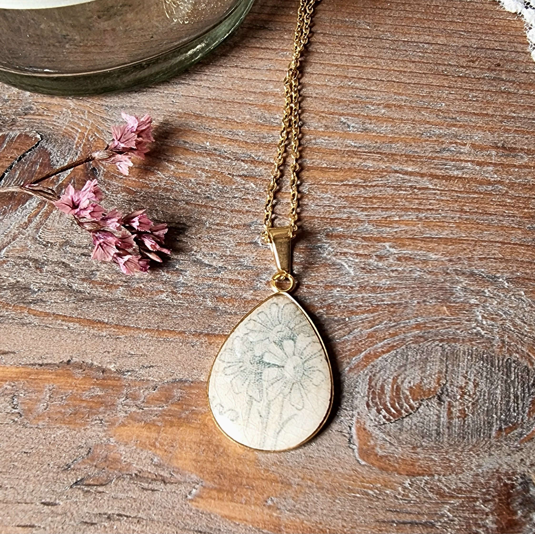 Ce collier met en valeur un fragment d’assiette ancien au motif floral délicat, marqué par un charme vintage et des nuances beiges très douces. Sa forme goutte crée une allure élégante et raffinée, parfaite pour celles qui aiment les bijoux poétiques et pleins d’histoire. Associé à sa finition dorée, ce pendentif devient une pièce chaleureuse et unique, facile à porter au quotidien.